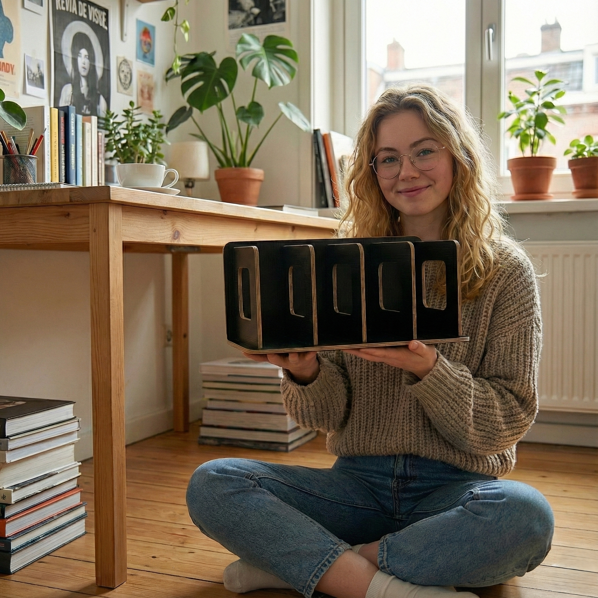 Zwarte houten CD standaard op een bureau die een favoriet CD-album toont naast een stapel boeken en een plant.